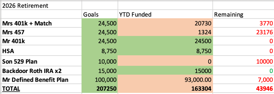 $163k we have invested into various tax protected accounts this year. Again, some of this money was extra cash we had leftover from the year prior and I also put my $40k tax refund into my defined benefit plan giving us a nice boost to get that maxed for the year. Next month, I am planning to max the DB plan ($7k more) and then also add $10k to my son’s 529 plan. After that, I will start saving up our funds for taxes (usually try to have around $100k cash by the end of the year as I file as an S-corp with a single payroll in December allowing me to pay my tax bill at the end of year).