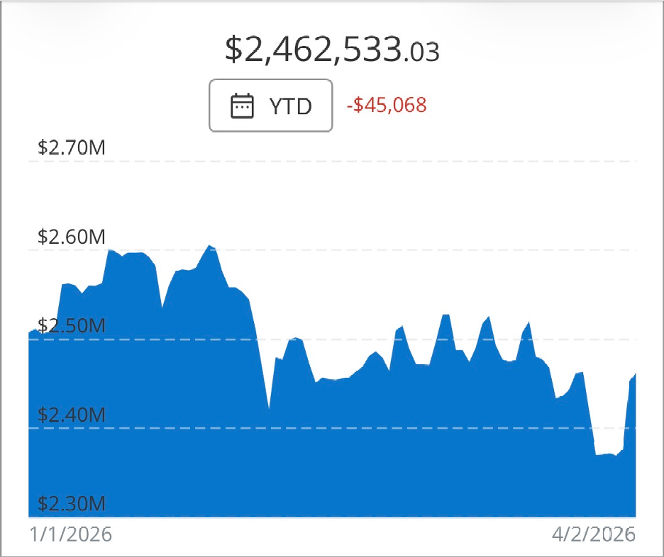 Ouch, it has been a tough start to the year. Empower shows us down about 10% for the year although we got a little boost back up at the end of the month. Regardless, we continue to invest every extra dollar we can.