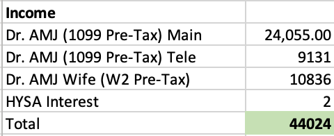 No major changes to our income this month, I continue to work part time emergency medicine with 8-10 clinical shifts a month and then supplement my income with telemedicine work. Thus far, I am very happy with the change and feel it is much more sustainable in the long run than full time clinical emergency medicine. My wife continues to work part time in the hospital as well.