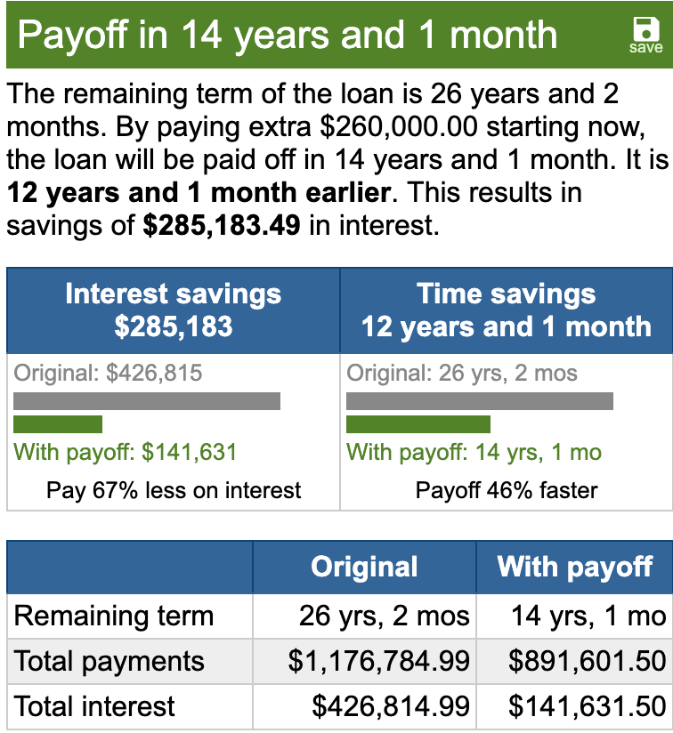 - We saved $285k in interest over the course of the loan (see numbers below):