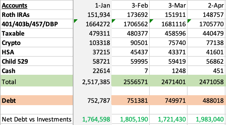 Next, I also received a large tax refund of just over $40,000. I did have a discussion with my CPA about it, overestimated capital gain taxes (had some tax loss harvesting from the previous year) resulting in a large refund. I immediately deployed this month into my defined benefit plan as I continue to aggressively fund all of our retirement accounts for the year even as we’ve had a big market pullback.