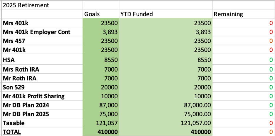 - DONE- PAID OFF IN FEBURARY!!!! Pay off remaining student loans. I start the year with ~$95k left in student loans refinanced to 1.1%. I know mathematically it makes zero sense, but I only have two years left on them regardless. I plan to fully fund my retirement accounts in the first quarter of 2025 and then have them gone by midway through the year.