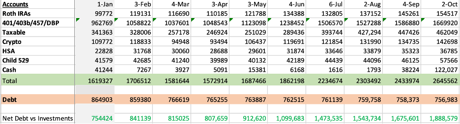 September was another solid month in the market. SP500 gained 3.5% and we remain fully invested. I also received a $70k inheritance check that I added to our HYSA, this will mainly be used to pay our end of year tax bills.