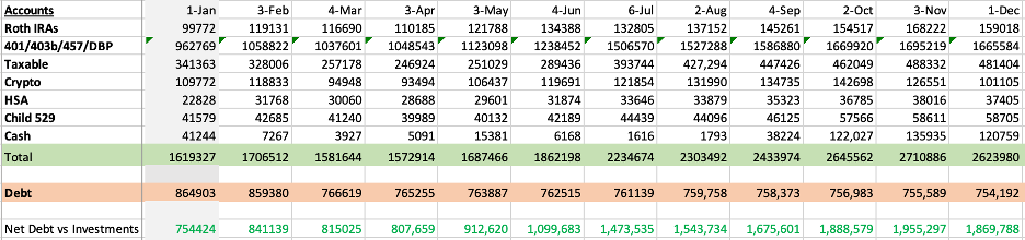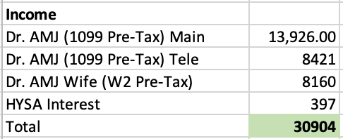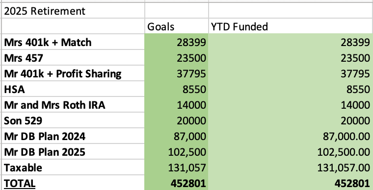I received my final tax planning numbers for my 401k and DB plan for the year and contributed the final amounts to those accounts. I don’t know if I will ever save so much money in a single year, it was a combination of different factors between inheritance, continued high income and no major expenses allowing us to save so much. I am planning to work less clinically next year as our finances continue to improve so saving this much next year is unlikely.